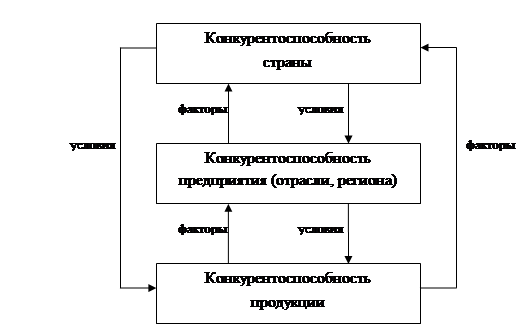 Рис.1.1. Схема взаимосвязи конкурентоспособности на различных уровнях Синтетическим показателем, который объединяет конкурентоспособность товара, товаропроизводителя, отраслевую конкурентоспособность и характеризует положение страны на мировом рынке, является показатель конкурентоспособности стран. В самом общем виде страновую конкурентоспособность можно определить как способность страны в условиях свободной конкуренции производить товары и услуги, удовлетворяющие требованиям мирового рынка, реализация которых увеличивает благосостояние страны и отдельных ее граждан [8, с.107]. Свое понятие конкурентоспособности страны вводит в своей теории Майкл Портер [13]. Именно национальная конкурентоспособность, с его точки зрения, определяет успех или неуспех в конкретных отраслях производства и то место, которое страна занимает в системе мирового хозяйства. Национальная конкурентоспособность определяется способностью промышленности постоянно развиваться и производить инновации. Первоначально национальные компании добиваются конкурентного преимущества, изменяя основу, на которой они конкурируют. Удержать же им преимущество позволяет постоянное совершенствование товара, способа производства и других факторов, причем так быстро, чтобы конкуренты не смогли их догнать и перегнать. Конкуренция — это не равновесие, а постоянные перемены. Совершенствование и обновление отрасли - непрерывный процесс. Поэтому в основе объяснения конкурентного преимущества страны лежит роль страны базирования в стимулировании обновления и совершенствования (т. е. в стимулировании производства инноваций). Таким образом, оказывается, что процесс создания и поддержания конкурентоспособности чрезвычайно локализован. Различия в экономике стран, в их культуре, населении, инфраструктуре, управлении, национальных ценностях и даже в истории - все это в той или иной степени влияет на конкурентоспособность национальных компаний. Портер показывает, что, несмотря на все возрастающее значение глобализации, национальная конкурентоспособность определяется набором факторов, зависящих от конкретных, локальных условий. Конкурентное преимущество страны на международном рынке определяет некий набор детерминантов, «национальный ромб», как называет его автор. Он включает в себя четыре компонента: 1. Факторные условия, то есть те конкретные факторы (например, квалифицированная рабочая сила или инфраструктура), которые нужны для успешной конкуренции в данной отрасли. 2. Условия спроса, то есть каков на внутреннем рынке спрос на продукцию или услуги, предлагаемые данной отраслью. 3. Родственные и поддерживающие отрасли, т. е. наличие или отсутствие в стране родственных и поддерживающих отраслей, конкурентоспособных на международном рынке. 4. Стратегия фирмы, ее структура и конкуренты, то есть каковы в стране условия, определяющие процесс создания управления фирм, и каков характер конкуренции на внутреннем рынке. Существуют две дополнительные переменные, в значительной степени влияющие на обстановку в стране: · случайные события, то есть те, которые руководство фирмы не может контролировать; · государственная политика. Крайне другой подход к конкурентоспособности страны содержится в работах П. Кругмана. Его позиция в отношении конкурентоспособности
