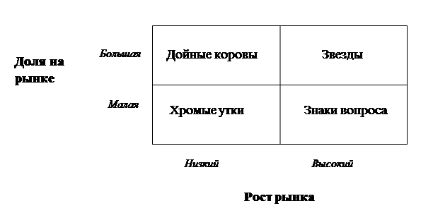 где Пк — произведение всех показателей: Пк = 1, если все показатели соответствуют стандарту, Пк = 0, если хотя бы один из показателей не соответствует стандарту. Считается, что если коэффициент конкурентоспособности меньше единицы, то предприятие предлагает на рынок явно не конкурентоспособный товар, и необходимо изменить его технические и экономические характеристики. Более того, считается, что превышение данного значения на 10-20% слишком мало, чтобы быть уверенным в успехе на рынке. Однако если это превышение составляет 30-50%, то считается, что предприятие занимает достаточно устойчивое положение. Превышение 50-70% говорит о верности выбранного направления действия фирмы на рынке. В основе построения матрицы БКГ лежит анализ конкурентоспособности с учетом жизненного цикла товара/услуги. Сущность оценки состоит в анализе матрицы, построенной по принципу системы координат: по горизонтали — темпы роста/сокращения количества продаж в линейном масштабе; по вертикали — относительная доля совокупности товаров/услуг на рынке. Наиболее конкурентоспособными считаются предприятия, которые занимают значительную долю на быстрорастущем рынке, т. е. являются «звездами» (рис.3.1) [1, с.35].