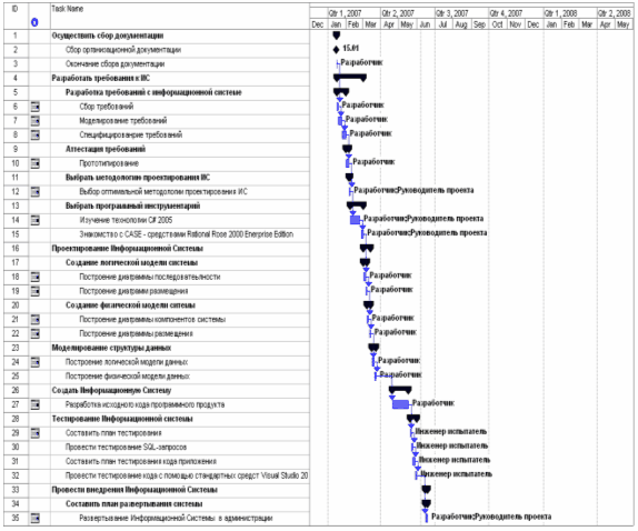 В качестве итога перечислим основные принципы методологии RAD: ¾ разработка приложений итерациями; ¾ необязательность полного завершения работ на каждом из этапов жизненного цикла; ¾ обязательное вовлечение пользователей в процесс разработки ИС; ¾ необходимое применение CASE-средств, обеспечивающих целостность проекта; ¾ применение средств управления конфигурацией, облегчающих внесение изменений в проект и сопровождение готовой системы; ¾ необходимое использование генераторов кода; ¾ использование прототипирования, позволяющее полнее выяснить и удовлетворить потребности конечного пользователя; ¾ тестирование и развитие проекта, осуществляемые одновременно с разработкой; ¾ ведение разработки немногочисленной хорошо управляемой командой профессионалов; ¾ грамотное руководство разработкой системы, четкое планирование и контроль выполнения работ [39]. 4.2 Определение цели и области действия программного проектаЦелью программного проекта является разработать и внедрить информационную систему первоначального учета граждан в поселении администрации для отдела воинского учета. Разработанная информационная система будет представлена в виде взаимосвязанных модулей, которые обеспечивают эффективный ввод, обработку и передачу информации с сохранением в серверной базе данных. К модулям относятся: ¾ Индивидуальная карточка – которая содержит необходимые сведения для постановки гражданина на первоначальный учет; ¾ Отчеты, создаваемые по введенным критериям; Область действия данной информационной системы не выходит за рамки отдела Воинского учета администрации села. Информационная система не будет применяться в операционных, отличных от Windows. 4.3 Создание структуры пооперационного перечня работПроцесс создания Информационной системы для отдела Воинского учета представляется в виде перечня работ, реализованном в прикладном пакете MicrosoftOfficeProject 2003 и включающий следующие этапы: ¾ анализ требований; ¾ изучение бизнес-цели проекта; ¾ постановка задач; ¾ создание технического задания; ¾ определение спецификаций проекта; ¾ оценка стоимости проекта; ¾ проектирование; ¾ определение логических объектов; ¾ построение схем взаимодействия объектов; ¾ определение функций системы; ¾ определение вариантов использования; ¾ проектирование уровня данных; ¾ проектирование уровня бизнес-логики; ¾ проектирование пользовательского интерфейса ¾ реализация; ¾ разработка уровня данных; ¾ разработка уровня бизнес-логики; ¾ разработка пользовательского интерфейса; ¾ интеграция системы; ¾ тестирование; ¾ отладка. Разработка руководства по использованию системы, краткая характеристика и требования системы; 4.4 Идентификация задач и действийВсе работы можно классифицировать по своим характеристикам: длительности, трудозатратам и количеству людских ресурсов. Данные параметры связаны друг с другом: трудозатраты задачи равны произведению длительности на количество людских ресурсов. Задачи в плане проекта могут быть трех типов: с фиксированными длительностью, трудозатратами и количеством ресурсов. Для того чтобы реализовать ту или иную задачу необходимы ресурсы. Рассмотрим подобно все задачи и ресурсы с помощью которых реализуются эти задачи. Таблица 4.3 – Ресурсы проекта