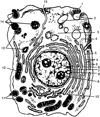 Рис. 2. Схема ультрамикроскопического строения клетки (по М. Р. Сапину, Г. Л. Билич, 1989): 1 — цитолемма (плазматическая мембрана); 2 — пиноцитозные пузырьки; 3 — центросома (клеточный центр, цитоцентр); 4 — гиалоплазма; 5 — эн-доплазматическая сеть (о — мембраны эндоплазматической сети, б — ри-босомы); 6— ядро; 7— связь перинуклеарного пространства с полостями эндоплазматической сети; 8 — ядерные поры; 9 — ядрышко; 10 — внутриклеточный сетчатый аппарат (комплекс Гольджи); 77-^ секреторные вакуоли; 12— митохондрии; 7J — лизосомы; 74—три последовательные стадии фагоцитоза; 75 — связь клеточной оболочки (цитолеммы) с мембранами эндоплазматической сети Ядро окружает цитоплазма, в состав которой входят ги-алоплазма, органеллы и включения. Гиалоплазма — это основное вещество цитоплазмы, она участвует в обменных процессах клетки, содержит белки, полисахариды, нуклеиновую кислоту и др. Постоянные части клетки, которые имеют определенную структуру и выполняют биохимические функции, называются органеллами. К ним относятся клеточный центр, митохондрии, комплекс Гольджи, эндоплазматическая (ци-топлазматическая) сеть. Клеточный центр обычно находится около ядра или комплекса Гольджи, состоит из двух плотных образований — центриолей, которые входят в состав веретена движущейся клетки и образуют реснички и жгутики. Митохондрии имеют форму зерен, нитей, палочек, формируются из двух мембран — внутренней и внешней. Длина митохондрии колеблется от 1 до 15 мкм, диаметр — от 0,2 до 1,0 мкм. Внутренняя мембрана образует складки (кри-сты), в которых располагаются ферменты. В митохондриях происходят расщепление глюкозы, аминокислот, окислении жирных кислот, образование АТФ (аденозинтрифосфорнай кислота) — основного энергетического материала. Комплекс Гольджи (внутриклеточный сетчатый аппарат) имеет вид пузырьков, пластинок, трубочек, расположенных вокруг ядра. Его функция состоит в транспорте веществ, химической их обработке и выведении за пределы клетки продуктов ее жизнедеятельности. Эндоплазматическая (цитоплазматическая) сеть формируется из агранулярной (гладкой) и гранулярной (зернистой) сети. Агранулярная Эндоплазматическая сеть образуется преимущественно мелкими цистернами и трубочками диаметром 50—100 нм, которые участвуют в обмене липи-дов и полисахаридов. Гранулярная Эндоплазматическая сеть состоит из пластинок, трубочек, цистерн, к стенкам которых прилегают мелкие образования — рибосомы, синтезирующие белки. Цитоплазма также имеет постоянные скопления отдельных веществ, которые называются включениями цитоплазмы и имеют белковую, жировую и пигментную природу. Клетка как часть многоклеточного организма выполняет основные функции: усвоение поступающих веществ и расщепление их с образованием энергии, необходимой для поддержания жизнедеятельности организма. Клетки обладают также раздражимостью (двигательные реакции) и способны размножаться делением. Деление клеток бывает непрямое (митоз) и редукционное (мейоз). Митоз — самая распространенная форма клеточного деления. Он состоит из нескольких этапов — профазы, метафазы, анафазы и телофазы. Простое (или прямое) деление клеток — амитоз — встречается редко, в тех случаях, когда клетка делится на равные или неравные части. Мейоз — форма ядерного деления, при котором количество хромосом 