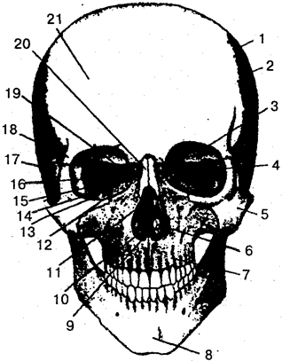 Рис. 32. Череп человека (вид спереди, по Р. Д. Синельникову): 1 — венечный шов; 2 — теменная кость; 3 — глазничная часть лобной кости; 4 — глазничная поверхность большого крыла, клиновидной кости; 5— скуловая кость; 6— нижняя носовая раковина; 7— верхняя челюсть; 8— подбородочный выступ нижней челюсти; 9 — полость носа; 10— сошник; 11— перпендикулярная пластинка решетчатой кости; 12— глазничная поверхность верхней челюсти; 13 — нижняя глазничная щель; 14 — слезная кость; 15 — глазничная пластинка решетчатой кости; 16 — верхняя глазничная щель; 17— чешуйчатая часть височной кости; 18— скуловой отросток лобной кости; 19— зрительный канал; 20— носовая кость; 21 — лобный бугор Свод черепа образован чешуйчатыми частями лобной, височных, затылочной костей и теменными костями. Основание черепа состоит из лобной, решетчатой, клиновидной, височной и затылочной костей. Различают внутреннее и наружное основание черепа.