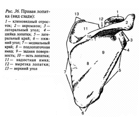 В лопатке выделяют реберную и дорсальную поверхности, верхний, нижний и латеральный углы, а также верхний, латеральный (боковой) и медиальный (внутренний) края. Дорсальная (задняя) поверхность лопатки остью лопатки разделена на надостную и подостную ямки; ость лопатки переходит в плечевой отросток — акромион. Лопатка имеет также суставную поверхность для соединения ее с плечевой костью и направленный вперед клювовидный отросток.