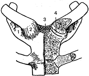 Рис. 28. Правая височная кость (наружная поверхность): 1 — барабанно-чешуйчатая щель; 2 — каменисто-барабанная щель; 3— шиловидный отросток; 4 — барабанно-сосцевидная щель Пирамида (каменистая часть) височной кости имеет трехгранную форму. В ней выделяют переднюю, заднюю и нижнюю поверхности. Передняя поверхность пирамиды участвует в образовании средней черепной ямки, задняя — задней черепной ямки, а нижняя входит в состав наружного основания черепа. На передней поверхности у вершины пирамиды находится тройничное вдавление, в котором лежит узел тройничного нерва. На задней поверхности пирамиды располагается внутреннее слуховое отверстие, которое переходит во внутренний слуховой проход. На дне последнего имеется несколько отверстий для лицевого, преддверно-улиткового черепных нервов и сосудов преддверно-улиткового органа. На задней поверхности пирамиды находятся наружное отверстие водопровода преддверия, каналец улитки, борозда сигмовидного синуса. От нижней поверхности пирамиды отходит длинный шиловидный отросток, около него находится шилососцевидное отверстие, через которое выходит лицевой нерв. В центре нижней поверхности пирамиды выделяется округлое отверстие, которое дает начало сонному каналу. В нем проходит внутренняя сонная артерия в полость черепа. Кзади от наружного отверстия сонного канала видна яремная ямка, которая в области заднего края пирамиды переходит в яремную вырезку. Яремные вырезки височной и затылочной костей, при их соединении, на целом черепе образуют яремное отверстие, через которое проходят внутренняя яремная вена и три черепных нерва: языкоглоточный, блуждающий и добавочный. В толще каменистой части находятся барабанная полость и костный лабиринт. Барабанная полость соединяется с воздухоносными ячейками сосцевидного отростка, а также с полостью носоглотки через канал слуховой трубы. В пирамиде височной кости проходят сонный и лицевой каналы, а также каналец барабанной струны, барабанный каналец, сосцевидный каналец, сонно-барабанные канальцы, в которых располагаются сосуды, нервы и мышца, напрягающая барабанную перепонку. Кости лицевого отдела черепа . Представлены парными костями (верхняя челюсть, нёбная, скуловая, носовая, слезная и нижняя носовая раковина) и непарными костями (нижняя челюсть, подъязычная кость и сошник). Верхняя челюсть (maxilla) состоит из тела и четырех отростков: лобного, скулового, нёбного и альвеолярного. В теле различают четыре поверхности: переднюю, подвисочную, глазничную и носовую. В теле верхней челюсти выделяется довольно крупная верхнечелюстная (гайморова) пазуха (рис. 29, 30).