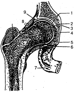 Рис. 50. Тазобедренный сустав (правый): 1— суставные хрящи; 2— тазовая кость; 3 — суставная полость; 4— связка головки бедренной кости; 5— поперечная связка вертлужной впадины; 6— капсула сустава; 7— седалищный бугор; 8— круговая зона; 9 — вертлужная губа Коленный сустав (articulatiogenus) — сложный мыщелковый сустав, образованный суставными поверхностями мыщелков бедренной кости, надколенника и верхней суставной поверхностью большеберцовой кости (рис. 51).