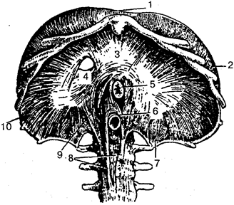 Рис. 61. Диафрагма (вид снизу): 1 — грудчнная часть диафрагмы; 2, 10— реберная часть диафрагмы; 3 — сухожильный центр;4 — отверстие для нижней полой вены; 5 — отверстие для пищевода; 6— отверстие для аорты; 7, 8, 9 — ножки поясничной части диафрагмы Диафрагма — главная дыхательная мышца, которая при сокращении увеличивает емкость легких (акт вдоха), при расслаблении снижает его объем (акт выдоха), а при сокращении одновременно с мышцами живота способствует повышению внутрибрюшного давления. Мышцы живота (mm. abdominis) образуют стенки брюшной полости, в которой залегают внутренние органы; участвуют в акте выдоха, в движении позвоночника, поддерживают внутрибрюшное давление. По топологическим признакам мышцы делятся на группы мышц передней, боковой и задней стенок живота (рис. 62).