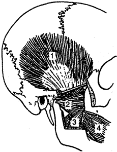 Рис. 66. Жевательные мышцы: 1 — височная мышца; 2 — латеральная крыловидная мышца; 3 — медиальная крыловидная мышца; 4 — щечная мышца Жевательная мышца (m. masseter) четырехугольная, начинается от нижнего края скуловой дуги; прикрепляется к наружной поверхности угла нижней челюсти, поднимает нижнюю челюсть. Височная мышца (т. tempo-ralis) начинается веерообразно от теменной и височной костей; прикрепляется к венечному отростку нижней челюсти. Сокращаясь, она поднимает нижнюю челюсть; передние пучки тянут челюсть вверх и вперед, а задние — назад. Латеральная крыловидная мышца (m. ptherygoideuslateralis) толстая, короткая, имеет две головки; начинается на верхнечелюстной поверхности и гребне большого крыла клиновидной кости; прикрепляется к передней поверхности шейки нижней челюсти и к суставной капсуле височ-но-нижнечелюстного сустава. При двустороннем сокращении нижняя челюсть выдвигается вперед, а при одностороннем — смещается в противоположную сторону Медиальная крыловидная мышца (m. ptherygoideusmedialis) — толстая мышца четырехугольной формы. Берет начало от крыловидной ямки одноименного отростка клиновидной кости; прикрепляется к углу нижней челюсти. Поднимает нижнюю челюсть, вытягивает ее вперед. Фасции головы (рис. 67). Собственная фасция головы делится на три отдела, покрывающие одноименные мышцы: 1) височная фасция; 2) жевательная; 3) щечно-глоточная фасция.