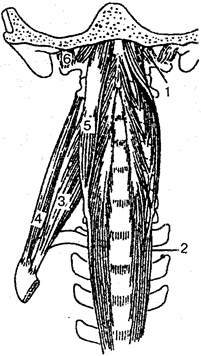 Рис. 68. Мышцы головы и шеи (вид справа и снизу): 1— жевательная мышца; 2 — глубокая часть жевательной мышцы; 3 — поверхностная часть жевательной мышцы; 4 — щечно-глоточная фасция; 5—грудино-ключично-сосцевидная мышца; 6— двубрюшная мышца Поверхностные мышцы шеи . Подкожная мышца (т. platisma) — тонкая пластинка, располагающаяся под кожей шеи. Начинается от фасции головы ниже ключицы и прикрепляется к углу рта, телу нижней челюсти и жевательной фасции. Сокращаясь, поднимает кожу шеи, защищает от сдавления поверхностные вены, оттягивает угол рта вниз. Грудино-ключично-сосце-видная мышца (m. stemocleido-mastoideus) начинается двумя частями от грудины и ключицы и прикрепляется к сосцевидному отростку височной кости. При одностороннем сокращении мышца поворачивает голову в противоположную сторону, при двустороннем — забрасывает голову назад, поворачивает лицо в противоположную сторону. Надподъязычные мышцы . Двубрюшная мышца (m. digastricus) — переднее брюшко начинается от нижней челюсти, заднее — от сосцевидной вырезки височной кости. Прикрепляется к подъязычной кости. Опускает нижнюю челюсть, тянет ее назад, поднимает подъязычную кость. Шилоподьязычная мышца (т. stylohyoideus) — тонкая веретенообразная мышца, берет начало от шиловидного отростка височной кости и прикрепляется к телу подъязычной кости. Тянет подъязычную кость кверху, назад и в свою сторону. Челюстно-подъязычная мышца (m. mylohyoideus) начинается от нижней челюсти, прикрепляется к передней поверхности подъязычной кости. Поднимает подъязычную кость вместе с гортанью; опускает нижнюю челюсть. Подбородочно-подъязычная мышца (m. geniohyoideus) начинается от ости нижней челюсти и прикрепляется к телу подъязычной кости; тянет подъязычную кость вверх и вперед, опускает нижнюю челюсть, поднимает подъязычную кость. Подподъязычные мышцы . Лопаточно-подъязычная мышца (m. omohyoideus) берет начало от лопатки и прикрепляется к подъязычной кости. При сокращении тянет подъязычную кость вниз, натягивает предтрахеальную пластинку шейной фасции, расширяет просвет глубоких вен шеи. Грудино-подьязычная мышца (m. sternohyoideus) начинается от задней поверхности грудины, рукоятки грудины, задней грудино-ключичной связки и прикрепляется к нижнему краю тела подъязычной кости; тянет подъязычную кость книзу. Щитоподьязычная мышца (m. thyrohyoideus) начинается от щитовидного хряща и прикрепляется к телу подъязычной кости. Поднимает гортань, подтягивает подъязычную кость к гортани. Глубокие мышцы шеи (рис. 69). Лестничные мышцы (передняя, средняя и задняя), mm. scalenus (anterior, mediusetposterior) начинаются от поперечных отростков II—VII шейных позвонков и прикрепляются к I—II ребрам. Поднимают I и II ребра, расширяют грудную клетку, наклоняют шейный отдел позвоночного столба вперед и в стороны.