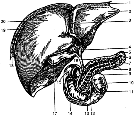 Рис. 78. Печень, двенадцатиперстная кишка, поджелудочная железа: 1 — левая треугольная связка; 2 — левая доля печени; 3 — серповидная связка (печени); 4— общий печеночный проток; 5— поджелудочная железа; 6— общий желчный проток; 7— хвост поджелудочной железы; 8— проток поджелудочной железы; 9 — двенадцатиперстно-тощий изгиб; 10 — тощая кишка; 11 — восходящая часть двенадцатиперстной кишки; 12 — головка поджелудочной железы; 13 — горизонтальная часть двенадцатиперстной кишки; 14 — нисходящая часть двенадцатиперстной кишки; 15 — верхняя часть двенадцатиперстной кишки; 16 ~ пузырный проток; 17— желчный пузырь; 18 ~ правая треугольная связка; 19— венечная связка; 20 — правая доля печени Часть тонкой кишки, имеющая брыжейку, лежит ниже поперечной ободочной кишки, и ее брыжейка образует 14— 16 петель, покрытых спереди большим сальником. Около 2/5 брыжеечной части тонкой кишки относится к тощей кишке и 3/5 — к подвздошной. Четко обозначенной границы между этими отделами тонкой кишки не существует. Тощая кишка (jejunum) лежит непосредственно после двенадцатиперстной кишки, ее петли расположены в левой верхней части брюшной полости. Диаметр тощей кишки составляет 3,5—4,5 см. Подвздошная кишка (ileum) является продолжением тощей кишки. Она занимает правую нижнюю часть брюшной полости и соединяется со слепой кишкой в области правой подвздошной ямки. Длина подвздошной кишки около 2,7 см. Тощая и подвздошная кишки покрыты брюшиной, образующей наружную серозную оболочку ее стенки, которая расположена на тонкой субсерозной основе. При этом брюшина формирует брыжейку, между листками которой идут кровеносные и лимфатические сосуды, нервы. Под субсерозной основой лежит мышечная оболочка, которая состоит из наружного продольного слоя, хорошо развитого, и внутреннего кругового слоя. За мышечной оболочкой находится подслизистая основа, в состав которой входит рыхлая соединительная ткань с множеством кровеносных, лимфатических сосудов и нервов. Слизистая оболочка тощей и подвздошной кишок образует круговые складки высотой около 8 мм, которые охватывают ½ — 2/3 окружности кишки. Высота складок в направлении от тощей до подвздошной кишки уменьшается. Складки покрыты кишечными ворсинками высотой 0,2 — 1,2 мм, что значительно увеличивает площадь всасывания слизистой оболочки тонкой кишки, которая покрыта однослойным призматическим эпителием и имеет хорошо развитую сеть кровеносных и лимфатических сосудов. В слизистой оболочке тощей кишки, кроме того, расположены одиночные лимфоидные узелки, а в слизистой оболочке подвздошной кишки их много и они объединяются в групповые лимфоидные узлы (пейеровы бляшки). Основу ворсинок составляет соединительная ткань собственной пластинки слизистой оболочки с небольшим количеством гладких мышечных клеток. В центральной части расположен лимфатический капилляр, вокруг которого, ближе к эпителию, проходят кровеносные сосуды. Толстая кишкаТолстая кишка (intestinumcrassum) является продолжением тонкого кишечника и конечным отделом пищеварительного тракта. В ней завершается переваривание пищи, формируются и выводятся наружу через анальное отверстие каловые массы. Расположена толстая кишка в брюшной полости и в полости малого таза; длина ее колеблется от 1 до 1,7 м; диаметр — до 4—8 см. В толстую кишку входят слепая кишка с червеобразным 