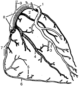 Рис. 93. Вены сердца (схема): 1 — левая венечная вена; 2 — задняя вена левого желудочка; 3 — передняя межжелудочко-вая вена; 4 — задняя межжелудочковая вена; 5 — передняя вена правого желудочка; 6 — правая краевая вена; 7— малая вена сердца; 8 — венечный синус; 9 — косая вена левого предсердия Система верхней полой веныВерхняя полая вена — короткий сосуд длиной 5—8 см и шириной 21—25 мм. Образуется путем слияния правой и левой плечеголовных вен. В верхнюю полую вену поступает кровь от стенок грудной и брюшной полостей, органов головы и шеи, верхних конечностей. Вены головы и шеи . Основным венозным коллектором от органов головы и шеи является внутренняя яремная вена и частично наружная яремная вена (рис.94).