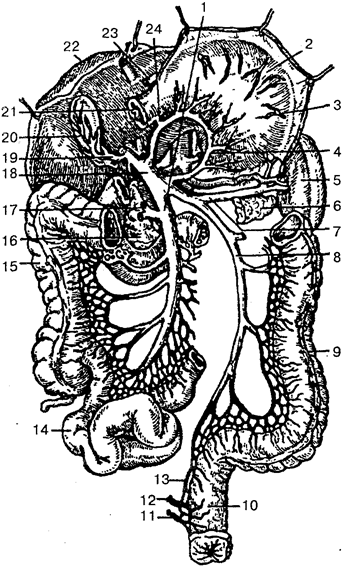 Рис. 96. Система воротной вены: 1 — верхняя брыжеечная вена; 2 — желудок; 3 — левая желудочно-сальниковая вена; 4 — левая желудочная вена; 5— селезенка; 6— хвост поджелудочной железы; 7— селезеночная вена; 8— нижняя брыжеечная вена; 9— нисходящая ободочная кишка; 10 — прямая кишка; 11 — нижняя прямокишечная вена; 12— средняя прямокишечная вена; 13— верхняя прямокишечная вена; 14 — подвздошная кишка; 15 — восходящая ободочная кишка; 16 — головка поджелудочной железы; 17, 23— правая желудочно-сальниковая вена; 18— воротная вена; 19— желчнопузырная вена; 20 — желчный пузырь; 21 — двенадцатиперстная кишка; 22 — печень; 24— привратниковая вена Селезеночная вена собирает кровь от селезенки, желудка, поджелудочной железы, двенадцатиперстной кишки и большого сальника. Притоками селезеночной вены являются короткие желудочные вены, панкреатические и левая желудочно-сальниковая. Нижняя брыжеечная вена образуется в результате слияния верхней прямокишечной вены, левой ободочной и сигмовидных вен; она собирает кровь от стенок верхней части прямой кишки, сигмовидной ободочной и нисходящей ободочной кишок. Лимфатическая системаЛимфатическая система — это часть сердечно-сосудистой системы (рис. 97). По лимфатической системе в кровеносную из тканей возвращаются вода, белки, жиры, продукты обмена веществ.