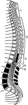 Рис. 100. Спинной мозг (схема): А: 1 — спинной мозг: 2 — шейное утолщение; 3 — пояснично-крестцовое утолщение; 4 — мозговой конус; 5 — концевая нить; Б: 1 — концевой желудочек; 2 — концевая нить Как рефлекторный центр спинной мозг способен осуществлять сложные двигательные и вегетативные рефлексы. Афферентными (чувствительными) путями спинной мозг связан с рецепторами, а эфферентными — со скелетной мускулатурой и со всеми внутренними органами. Длинные нисходящие и восходящие пути спинного мозга соединяют периферические части тела с головным мозгом. По внешнему виду спинной мозг представляет собой продолговатый, несколько плоский цилиндрический тяж. Он расположен в позвоночном канале и на уровне нижнего края большого затылочного отверстия переходит в головной мозг. Нижняя граница спинного мозга соответствует уровню I— II поясничных позвонков. Ниже этого уровня он продолжается в тонкую терминальную (концевую) нить. У взрослого человека длина спинного мозга в среднем составляет около 43 см (у мужчин 45 см, у женщин 41— 42 см), масса — около 34—38 г. Как и позвоночник, спинной мозг имеет шейный и грудной изгибы, а также шейное и по-яснично-крестцовое утолщения. В связи с метамерностью строения тела человека он делится на сегменты, или нейромеры (рис. 101). Сегмент — это участок спинного мозга, который соответствует паре спинномозговых нервов.