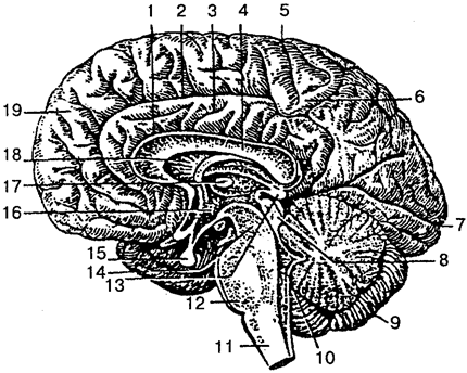 Рис. 107. Головной мозг (сагиттальный разрез): 1 — борозда мозолистого тела; 2 — поясная борозда; 3 — поясная извилина; 4— мозолистое тело; 5— центральная борозда; 6— парацентральная долька; 7— шпорная борозда; 8— пластинка крыши (четверохолмия); 9 — мозжечок; 10 — IV желудочек; 11 — продолговатый мозг; 12 — мост; 13 — шишковидное тело (эпифиз); 14— ножки мозга; 15— гипофиз; 16— III желудочек; 17—межталамическое сращение; 18 — прозрачная перего-родка; 19 — верхняя лобная извилина Под мозолистым телом находится тонкая белая пластинка, называемая телом свода, которое продолжается в столб свода. Последний заканчивается сосцевидным телом, а сзади переходит в ножки свода. Между столбами свода поперечно проходит пучок нервных волокон — передняя спайка мозга, связывающая между собой полушария большого мозга. Столбы свода окружают тонкую пластинку мозгового вещества — прозрачную перегородку. Все вышеперечисленные образования входят в состав конечного мозга, а структуры, расположенные ниже, относятся к стволу мозга (промежуточный, средний, задние отделы головного и продолговатого мозга). Передние отделы мозгового ствола образованы зрительными буграми, которые находятся книзу от тела свода и мозолистого тела и сзади столбов свода. На срединном разрезе видна только медиальная поверхность заднего таламуса (зрительного бугра), которая ограничивает щелевидную, вертикально расположенную полость III желудочка. Между передним концом таламуса и столбом свода находится межжелудочковое отверстие, при помощи которого боковой желудочек полушария соединяется с полостью III желудочка, в образовании дна которого участвуют зрительный перекрест, серый бугор, воронка, гипофиз, сосцевидные тела. Сверху и снизу от зрительного бугра, под валиком мозолистого тела, находится шишковидное тело, передненижние отделы которого срастаются тонким, идущим поперек тяжем — эпиталамической (задней) спайкой. От нее внизу берет начало водопровод среднего мозга. Зрительный бугор (таламус), гипоталамус, III желудочек, шишковидное тело относятся к промежуточному мозгу. Ниже шишковидного тела расположена крыша среднего мозга (пластинка четверохолмия), состоящая из верхнего и нижнегохолмиков. Вентральное пластинки крыши среднего мозга находится ножка мозга, отделенная от пластинки водопроводом среднего мозга. Через водопровод среднего мозга соединяются полости III и ГУ желудочков. Еще более кзади располагаются мост, мозжечок, которые относятся к заднему и продолговатому мозгу. Полость этих органов мозга составляет IV желудочек, дно которого образовано дорсальными поверхностями моста и продолговатого мозга, составляющими ромбовидную ямку. В головном мозге выделяют пять отделов: продолговатый мозг, задний мозг, средний мозг, промежуточный и конечный мозг. Продолговатый мозг (рис. 108).