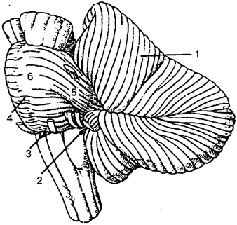 Рис. 109. Задний мозг: 1 — мозжечок; 2 — мостомозжечковый треугольник; 3 — бульбарно-мостовая борозда; 4 – базилярная борозда; 5 — средняя мозжечковая ножка; 6 - мост Мост (варолиев мост) снизу граничит с продолговатым мозгом, сверху проходит в ножки мозга, боковые его отделы образуют средние мозжечковые ножки (рис. 110).