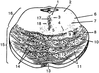 Рис. 110. Поперечный срез моста (схема): 1 — задний продольный пучок; 2 — среднемозговой путь тройничного нерва; 3— медиальный продольный пучок; 4 — медиальная петля; 5— ретикулярная формация; 6— тройничная петля (тройнично-таламический путь); 7— спинномозговая петля; 8— мостомозжечковые волокна; 9— корково-ядерные волокна; 10— корково-мостовые волокна; 11 — ядра моста; /2—корково-спинномозговые волокна; 13 — базилярная борозда; 14 — поперечные волокна моста; 15 — передняя (базилярная) часть моста; 16 — задняя часть моста (покрышка моста); / 7—шов моста; 18— покрышечно-спинномозговой путь Из глубокой горизонтальной борозды, отделяющей мост от пирамид продолговатого мозга, выходят корешки отводящих нервов (VI пара), ядра которых лежат в дорсальном отделе моста. В латеральной части этой борозды видны корешки лицевого (VII пара) и преддверно-улиткового (VIII пара) нервов. Продолжение моста в латеральном направлении образует среднюю ножку моста. На вентральной поверхности моста имеется широкая, но неглубокая базилярная борозда, от нее с боков идут два продольных волокна, внутри которых проходят волокна пирамидных путей. Дорсальная поверхность моста прикрыта мозжечком и ее не видно снаружи. От дорсальной поверхности продолговатого мозга она отделяется мозговыми полосками и вместе с ней участвует в образовании ромбовидной ямки, или дна IV желудочка. Из переднебоковых отделов моста выходят пучки тройничного нерва, ядра которого лежат в дорсальной части моста и продолговатого мозга (V пара). На поперечном срезе моста виден толстый пучок поперечных волокон, которые относятся к проводящему пути слухового анализатора и образуют трапециевидное тело. Последнее делит мост на заднюю (покрышка моста) и переднюю (базилярную) части. Между волокнами этого тела находится верхнее оливное ядро. Непосредственно над трапециевидным телом лежат волокна медиальной петли, идущей от продолговатого мозга; над ней расположена ретикулярная формация моста. Сбоку и выше медиальной петли проходят волокна латеральной (слуховой) петли, а над ретикулярной формацией лежит задний продольный пучок. Мозжечок располагается кзади от моста и от верхней части продолговатого мозга, заполняя большую часть задней черепной ямки. В мозжечке различают верхнюю и нижнюю поверхности, границей между ними является задний край мозжечка, где проходит глубокая горизонтальная щель. Мозжечок лежит на дорсальной поверхности ствола мозга, охватывает его с боков и при помощи ножек соединяется с его частями: верхние мозжечковые ножки соединяют мозжечок со средним мозгом, средние — с мостом; нижние — с продолговатым мозгом. В мозжечке различают два полушария и непарную среднюю часть — червь мозжечка. На верхней и нижней поверхности полушарий и червя находится много параллельно идущих щелей мозжечка, между которыми находятся длинные и узкие извилины мозжечка. Группы извилин, обособленные более глубокими бороздами, образуют дольки мозжечка. Полушария и червь мозжечка состоят из белого вещества, расположенного кнутри, и тонкой прослойки серого вещества коры мозжечка, которая охватывает белое вещество на периферии. Кора мозжечка представлена тремя слоями нервных клеток. Белое вещество мозжечка на разрезе напоминает разветвленное дерево, отсюда и его название «дерево жизни». В толще белог