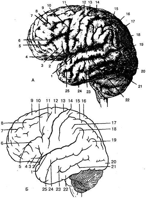 Рис. 112. Головной мозг: верхнелатеральная поверхность, борозды и извилины (схема): А, Б: 1 — латеральная борозда; 2 — покрышечная часть нижней лобной извилины; 3 — треугольная часть нижней лобной извилины; 4— глазничная часть нижней лобной извилины; 5— нижняя лобная борозда; 6 — нижняя лобная извилина; 7—верхняя лобная борозда; 8— средняя лобная извилина; 8— верхняя лобная извилина; 10— нижняя предцентральная борозда; 11 — верхняя предцентральная борозда; 12 — пред-центральная извилина; 13 — центральная борозда; 14 — постцентральная борозда; 15 — внутритеменная борозда; 16 — верхняя теменная долька; 17 — нижняя теменная долька; 18— надкраевая извилина; 19— угловая извилина; 20 — затылочный полюс; 21 — нижняя височная борозда; 22 — верхняя височная извилина; 23 — средняя височная извилина; 24— нижняя височная извилина; 25— верхняя височная борозда По теменной доле проходят постцентральная и внутритеменная борозды. Они делят теменную долю на постцентральную извилину, а также на верхнюю и нижнюю теменные дольки. Затылочная доля расположена позади теменно-затылоч-ной борозды. По сравнению с другими долями она меньше по размерам и заканчивается затылочным полюсом. Размеры борозд и извилин в затылочной доле весьма вариабельны. Лучше других выражена поперечная затылочная борозда. Височная доля отделяется от лобной и теменной глубокой латеральной бороздой. Кроме того, на верхнелатеральной ее поверхности имеются две борозды, которые делят поверхность мозга на верхнюю, среднюю и нижнюю извилины. Верхняя височная извилина находится между латеральной бороздой сверху и верхней височной снизу. Средняя височная извилина лежит между верхней и нижней височными бороздами. Нижняя височная извилина занимает нижнелатеральный край височной доли и ограничена сверху одноименной бороздой; задний конец этой извилины продолжается в затылочную долю. Островковая доля (островок) находится в глубине латеральной борозды. Эту долю можно найти, если удалить прикрывающие островок участки лобной, теменной и височной долей. Глубокая круговая борозда отделяет островок от окружающих его отделов мозга. На поверхности островка находятся длинная и короткие извилины. Между длинной и короткими извилинами лежит центральная борозда островка. Медиальную поверхность полушария большого мозга образуют все его доли, кроме островковой. Над мозолистым телом находится борозда мозолистого тела, которая направляется вниз и вперед и продолжается в гиппокампальную борозду. Выше борозды мозолистого тела лежит поясная борозда. Она берет начало от клюва мозолистого тела, затем идет вверх и заканчивается выше и кзади от валика мозолистого тела как подтеменная борозда. Между бороздой мозолистого тела и поясной лежит поясная извилина, которая охватывает спереди, сверху и сзади мозолистое тело. Спереди других борозд и извилин на медиальной поверхности выделяются парацентральная долька, шпорная борозда затылочной доли, а также язычная извилина и коллатеральная борозда. Нижняя поверхность полушария большого мозга имеет очень сложный рельеф. На нижней поверхности лобной доли находится обонятельная борозда, к которой снизу прилегают обонятельная луковица и обонятельный тракт, переходящие затем в обонятельный треугольник. Между продольной щелью большого мозга и обонятельной 