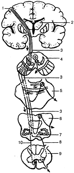 Рис. 113. Схема проводящих путей болевой, температурной и тактильной чувствительности: 1 — латеральный спинно-таламический путь; 2 — передний спинно-таламический путь; 3 —зрительный бугор; 4— медиальная петля; 5— поперечный срез среднего мозга; 6 — поперечный срез моста; 7 — поперечный срез продолговатого мозга; 8 — спинномозговой узел; 9 — поперечный срез спинного мозга Нисходящие (эффекторные, эфферентные) проекционные пути делятся на две группы: 1) главный двигательный, корково-спинномозговой (пирамидный) путь (рис. 114), который несет импульсы произвольных движений от коры к мышцам головы, шеи, туловища; 2) экстрапирамидные двигательные пути, которые передают импульсы от подкорковых центров к двигательным ядрам черепных и спинномозговых нервов, а затем к мышцам.