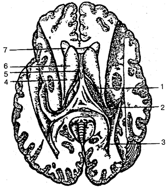 Рис. 115. Боковые желудочки большого мозга (вскрыты), разрез в горизонтальной плоскости: 1 — центральная часть бокового желудочка; 2 — нижний рог; 3 — задний рог; 4 — межжелудочко-вое отверстие; 5 — прозрачная перегородка; 6 — головка хвостатого ядра; 7— передний рог Полость желудочков различная по форме, поскольку она образуется отделами всех долей полушарий (кроме островковой). Центральная часть желудочка залегает в теменной доле. От центральной части во все доли мозга расходятся отростки — рога: передний (лобный)— в лобную долю; нижний (височный) — в височную; задний (затылочный) — в затылочную долю. Боковые желудочки замкнуты со всех сторон, за исключением межжелудочкового отверстия, через которое они соединяются с III желудочком, а при его помощи — друг с другом. Третий желудочек — непарная полость щелевидной формы, расположен в промежуточном мозге. Полость этого желудочка ограничена шестью стенками: двумя латеральными, верхней, нижней, средней и задней. Латеральными стенками являются медиальные поверхности таламусов. Верхняя стенка образована сосудистой основой (мягкой сосудистой оболочкой). Нижней стенкой, или дном, III желудочка, служит гипоталамус. Передняя стенка образована терминальной пластинкой, столбами свода и передней спайкой. Через межжелудочковое отверстие полость III желудочка соединяется с боковыми желудочками. Задней стенкой служит эпиталамическая спайка, под которой находится отверстие водопровода мозга. Четвертый желудочек является производным полости ромбовидного мозга (рис. 116). По форме полость IV желудочка напоминает палатку, дно которой имеет форму ромба (ромбовидная ямка), образована задними поверхностями продолговатого мозга и моста, а также мозжечком и перешейком ромбовидного мозга. Полость IV желудочка соединяется с субарахноидальным пространством тремя отверстиями — непарным средним и парными боковыми.