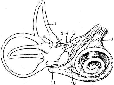 Рис. 148. Преддверно-улитковый орган (орган слуха и равновесия): 1— верхний полукружный канал; 2— преддверие; 3 — улитка; 4— слуховой нерв; 5 — сонная артерия; 6 — слуховая труба; 7— барабанная полость; 8— барабанная перепонка; 9— наружный слуховой проход; 10— наружное слуховое отверстие; 11 — ушная раковина; 12— молоточек Наружное ухо включаетушную раковину, наружный слуховой проход и барабанную перепонку, которые предназначены для улавливания и проведения звуковых колебаний. Ушная раковина состоит из эластического хряща и имеет сложную конфигурацию, снаружи покрыта кожей. Хрящ отсутствует в нижней части, так называемой дольке ушной раковины или мочке. Свободный край раковины завернут и называется завитком, а параллельно ему идущий валик — противозавитком. У переднего края ушной раковины выделяется выступ — козелок, а сзади него располагается проти-вокозелок. Ушная раковина прикрепляется к височной кости связками, имеет рудиментарные мышцы, которые хорошо выражены у животных. Ушная раковина устроена так, чтобы максимально концентрировать звуковые колебания и направлять их в наружное слуховое отверстие. Наружный слуховой проход представляет собой S-образную трубку, которая снаружи открывается слуховым отверстием и слепо заканчивается в глубине и отделяется от полости среднего уха барабанной перепонкой. Длина слухового прохода у взрослого человека составляет около 36 мм, диаметр в начале достигает 9 мм, а в узком месте б мм. Хрящевая часть, являющаяся продолжением хряща ушной раковины, составляет 1/3 его длины, остальные 2/3 образованы костным каналом височной кости. В месте перехода одной части в другую наружный слуховой проход суженный и изогнутый. Он выстлан кожей и богат жировыми железами, а также железами, которые выделяют ушную серу. Барабанная перепонка — тонкая полупрозрачная овальная пластинка размером 11´9 мм, которая находится на границе наружного и среднего уха. Расположена наискось, с нижней стенкой слухового прохода образует острый угол. Барабанная перепонка состоит из двух частей: большой нижней — натянутой части и меньшей верхней — ненатянутой части. Снаружи она покрыта кожей, основу ее образует соединительная ткань, внутри выстлана слизистой оболочкой. В центре барабанной перепонки есть углубление — пупок, который соответствует прикреплению с внутренней стороны рукоятки молоточка. Среднее ухо включает выстланную слизистой оболочкой и заполненную воздухом барабанную полость (объемом около 1 см3 ) и слуховую (евстахиеву) трубу. Полость среднего уха соединяется с сосцевидной пещерой и через нее — с сосцевидными ячейками сосцевидного отростка. Барабанная полость находится в толще пирамиды височной кости, между барабанной перепонкой латерально и костным лабиринтом медиально. Она имеет шесть стенок: 1) верхнюю покрышечную — отделяет ее от полости черепа и находится на верхней поверхности пирамиды височной кости; 2) нижнюю яремную — стенка отделяет барабанную полость от наружного основания черепа, находится на нижней поверхности пирамиды височной кости и соответствует области яремной ямки; 3) медиальную лабиринтную — отделяет барабанную полость от костного лабиринта внутреннего уха. На этой стенке находится овальное отверстие — окно преддверия, закрытое основанием стремени; несколько выше на этой 