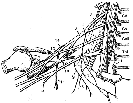 Рис. 134. Плечевое сплетение (схема): 1 — диафрагмальный нерв; 2 — дорсальный нерв лопатки; 3 — верхний ствол плечевого сплетения; 4 — средний ствол плечевого сплетения; 5 — подключичный ствол; 6 — нижний ствол, плечевого сплетения; 7 — добавочные диафрагмальные нервы; 8 — длинный грудной нерв; 9 — медиальный грудной нерв; 10 — латеральный грудной нерв; 11 — медиальный пучок; 12 — задний пучок; 13 — латеральный пучок; 14 — надлопаточный нерв В межлестничном промежутке передние ветви образуют три ствола — верхний, средний и нижний. Эти стволы делятся на ряд ветвей и направляются в подмышечную ямку, где формируют три пучка (латеральный, медиальный и задний) и окружают подмышечную артерию с трех сторон. Стволы плечевого сплетения вместе с их ветвями, лежащими выше ключицы, называются надключичной частью, а с ветвями, лежащими ниже ключицы, — подключичной частью. Ветви, которые отходят от плечевого сплетения, делятся на короткие и длинные. Короткие ветви иннервируют главным образом кости и мягкие ткани плечевого пояса, длинные — свободную верхнюю конечность. В составе коротких ветвей плечевого сплетения находятся дорсальный нерв лопатки — иннервирует мышцу, поднимающую лопатку, большую и малую ромбовидные мышцы; длинный грудной нерв — переднюю зубчатую мышцу; подключичный — одноименную мышцу; надлопаточный — над- и полостную мышцы, капсулу плечевого сустава; подлопаточный— одноименную и большую круглую мышцы; грудо-спинной — широчайшую мышцу спины; латеральные и медиальные грудные нервы— одноименные мышцы; подмышечный нерв — дельтовидную и малую круглую мышцы, капсулу плечевого сустава, а также кожу верхних отделов боковой поверхности плеча. Длинные ветви плечевого сплетения берут начало от латерального, медиального и заднего пучков подключичной части плечевого сплетения (рис. 135, А, Б).