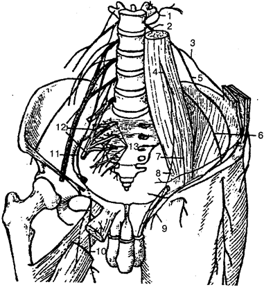 Рис. 136. Пояснично-крестцовое сплетение: 1-задние ветви поясничных нервов; 2- передние ветви поясничных нервов; 3- подвздошно-подчревный нерв; 4- бедренно-половой нерв; 5-подвздошно-паховый нерв; 6 - латеральный кожный нерв бедра; 7- бедренная ветвь; 8- половая ветвь; 9 - передние мошоночные нервы; 10 -передняя ветвь запирательного нерва; 11 - запирательный нерв; 12 — пояснично-крестцовое сплетение; 13 - передние ветви крестцового сплетения Поясничное сплетение формируется передними ветвями трех верхних поясничных и частично передними ветвями XII грудного и IV поясничного спинномозговых нервов. Оно лежит кпереди от поперечных отростков поясничных позвонков в толще большой поясничной мышцы и на передней поверхности квадратной мышцы поясницы. От всех передних ветвей поясничных нервов отходят короткие мышечные ветви, иннервирующие большую и малую поясничные мышцы, квадратную мышцу поясницы и межпоясничные латеральные мышцы поясницы. Наиболее крупными ветвями поясничного сплетения являются бедренный и запирательный нервы. Бедренный нерв формируется тремя корешками, которые сначала идут вглубь большой поясничной мышцы и соединяются на уровне V поясничного позвонка, образуя ствол бедренного нерва. Направляясь вниз, бедренный нерв располагается в борозде между большой поясничной и подвздошной мышцами. На бедро нерв выходит через мышечную лакуну, где отдает ветви передним мышцам бедра и коже переднемедиальной поверхности бедра. Наиболее длинная ветвь бедренного нерва — подкожный нерв бедра. Последний вместе с бедренной артерией входит в приводящий канал, затем вместе с нисходящей коленной артерией следует по медиальной поверхности голени до стопы. На своем пути иннервирует кожу коленного сустава, надколенника, частично кожу голени и стопы. Запирательный нерв — вторая по величине ветвь поясничного сплетения. Из поясничной области нерв опускается вдоль медиального края большой поясничной мышцы в малый таз, где вместе с одноименными артерией и веной идет через запирательный канал на бедро, отдает мышечные ветви приводящим мышцам бедра и делится на две конечные ветви: переднюю (иннервирует кожу медиальной поверхности бедра) и заднюю (иннервирует наружную за-пирательную, большую приводящую мышцы, тазобедренный сустав). Кроме того, от поясничного сплетения отходят более крупные ветви: 1) подвздошно-подчревный нерв — иннервирует мышцы и кожу передней стенки живота, часть ягодиной области и бедра; 2) подвздошно-паховый нерв — иннервирует кожу лобка, паховой области, корень полового члена, мошонку (кожу больших половых губ); 3) бедренно-по-ловой нерв — делится на две ветви: половую и бедренную. Первая ветвь иннервирует часть кожи бедра, у мужчин — мышцу, поднимающую яичко, кожу мошонки, и мясистую оболочку; у женщин — круглую маточную связку и кожу больших половых губ. Бедренная ветвь через сосудистую лакуну проходит на бедро, где иннервирует кожу паховой связки и области бедренного канала; 4) латеральный кожный нерв бедра — выходит из полости таза на бедро, иннервирует кожу латеральной поверхности бедра до коленного сустава. Крестцовое сплетение образуется передними ветвями верхних четырех крестцовых, V поясничного и частично IV поясничного спинномозговых нервов. Передние ветви последних образуют пояснично-крестцовый ствол. Он опуск