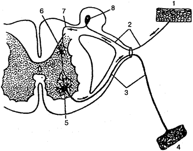 Рис. 143. Схема рефлекторной дуги: 1 — нервные окончания чувствительного нейрона в коже; 2— периферический отросток чувствительного нейрона; 3 — нейрит двигательной клетки; 4 — нервное окончание в мышце; 5 — двигательная клетка переднего рога; 6— вставочный нейрон; 7— центральный отросток чувствительного нейрона; 8— спинномозговой узел В осуществлении безусловных рефлексов ведущая роль принадлежит подкорковым ядрам, мозговому стволу, спинному мозгу. Безусловные рефлексы — относительно постоянные рефлекторные реакции, малоизменяющиеся, инертные, в результате чего за счет безусловных рефлексов невозможно приспособиться к новым условиям существования. Типы высшей нервной деятельности.Сигнальные системыФормирование типов высшей нервной деятельности зависит от силы процессов возбуждения и торможения, их равновесия и изменчивости (подвижности). На основе этих признаков различают четыре типа высшей нервной деятельности: 1) сильный неуравновешенный (возбуждение преобладает над торможением); 2) сильный уравновешенный, с большой подвижностью нервных процессов; 3) сильный уравновешенный, с малой подвижностью нервных процессов и 4) слабый, с недостаточным развитием возбуждения и торможения. У человека первый тип соответствует сангвиническому типу (условные рефлексы быстро возникают, легко угасают и восстанавливаются). При этом возбуждение быстро сменяется торможением и наоборот. Люди с таким типом высшей нервной деятельности отличаются живым темпераментом, выразительной мимикой, хорошим поведением и т. д. Второй тип — флегматический (условные рефлексы образуются быстро, закрепляются, имеют сильные тормозные реакции). Люди такого типа ведут себя спокойно, ровно, речь их без резких выразительных эмоций и др. Третий тип — холерический, сильный, повышенно возбудимый, неуравновешенный. Условные рефлексы образуются медленно, слабые. Человек с этим типом нервной системы высокоэмоциональный, легковозбудимый, запальчивый. Четвертый тип — меланхолический, слабый, со сниженной возбудимостью, с медленным формированием условных реакций. Люди с меланхолическим типом нервной системы быстро устают, речь их тихая, бедная словами, они часто страдают невротическими реакциями и неврозами. Первая сигнальная система обеспечивает восприятие конкретных раздражителей (звук, химические и физические факторы и др.) внешней среды, их анализ и синтез корой головного мозга. Она свойственна как человеку, так и животному Вторая сигнальная система возникла в процессе трудовой деятельности, общественных отношений и формирования нервных функций мозга: восприятия и произношения слов, мимики, жестов, их понимания. При этом словесная сигнализация, речь, язык являются главнейшими средствами отношений между людьми. Таким образом, вторая сигнальная система играет важную роль в обучении человека. Изменение социальной среды влечет за собой и изменения в формировании второй сигнальной системы. Физиология снаИзвестно, что смена дня и ночи ведет за собой суточные, или циркадные, ритмы поведения. Периодическая смена освещения и сопутствующих внешних раздражении играют особенно важную роль в становлении внутреннего ритма. Смена сна и бодрствования — это одно из проявлений внутреннего суточного ритма организма человека, является не пременным условием ж