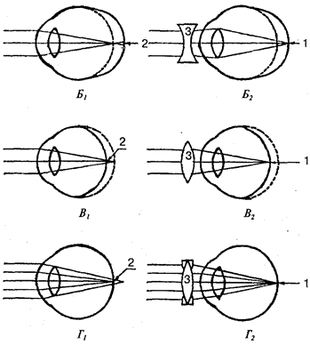 Процесс зрительного возбуждения возникает в период между образованием люми- и метародопсина II. После прекращения воздействия света родопсин тотчас же ресинтезируется. Вначале полностью при участии фермента рети-нальизомеразы транс-ретиналь превращается в 11-цисретиналь, а затем последний соединяется с опсином, вновь образуя родопсин. Этот процесс беспрерывный и лежит в основе темновой адаптации. В полной темноте необходимо около 30 мин, чтобы все палочки адаптировались и глаза приобрели максимальную чувствительность. Формирование изображения в глазу происходит при участии оптических систем (роговицы и хрусталика), дающих перевернутое и уменьшенное изображение объекта на поверхности сетчатки. Приспособление глаза к ясному видению на расстоянии удаленных предметов называют аккомодацией. Механизм аккомодации глаза связан с сокращением ресничных мышц, которые изменяют кривизну хрусталика. При рассмотрении предметов на близком расстоянии одновременно с аккомодацией действует и конвергенция, т. е. происходит сведение осей обоих глаз. Зрительные линии сходятся тем больше, чем ближе находится рассматриваемый предмет. Преломляющую силу оптической системы глаза выражают в диоптриях («Д» — дптр). За 1 Д принимается сила линзы, фокусное расстояние которой составляет 1 м. Преломляющая сила глаза человека составляет 59 дптр при рассмотрении далеких предметов и 70,5 дптр при рассмотрении близких. Существуют три главные аномалии преломления лучей в глазу (рефракции): близорукость, или миопия; дальнозоркость, или гиперметропия; старческая дальнозоркость, или пресбиопия (рис. 147). Основная причина всех дефектов глаза состоит в том, что не согласуются между собой преломляющая сила и длина глазного яблока, как в нормальном глазу. При близорукости (миопии) лучи сходятся перед сетчаткой в стекловидном теле, а на сетчатке вместо точки возникает круг светорассеяния, глазное яблоко при этом имеет большую длину, чем в норме. Для коррекции зрения используют вогнутые линзы с отрицательными диоптриями.