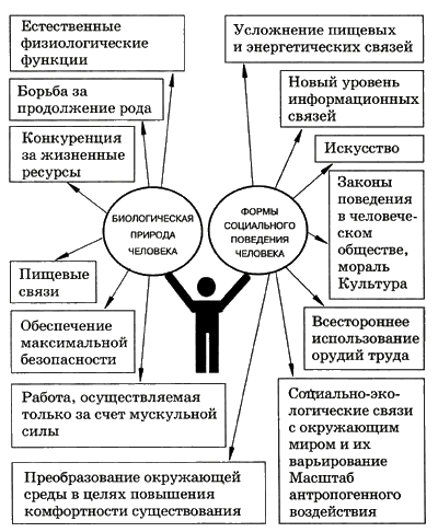 Человек – высшая ступень развития живых организмов на Земле. Он, по И.Т. Фролову (1985), «биосоциальное существо, генетически связанное с другими формами жизни, но выделившееся из них благодаря способности производить орудия труда, обладающее членораздельной речью и сознанием, творческой активностью и нравственным самосознанием». Биосоциальная природа человека выражается в том, что в его жизнь входят как биологические, так и социальные элементы. Это вызывает необходимость не только его биологической, но и социальной адаптации, т.е. приведения межиндивидуального и группового поведения в соответствие с господствующими в данном обществе нормами и ценностями путем усвоения знаний об этом обществе. Биологическая адаптация человека стремится сохранить не только его биологические, но и социальные функции при возрастающем значении социального фактора. Последнее обстоятельство имеет важное экологическое значение и нашло свое отражение в экологическом подходе к определению понятия человек . Человек – один из видов животного царства со сложной социальной организацией и трудовой деятельностью, в значительной мере «снимающими» (делающими малозаметными) биологические, в том числе этологические (первично-поведенческие) свойства организма (Н.Ф. Реймерс, 1990). |