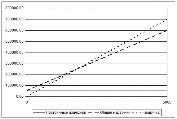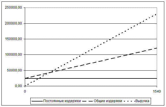 Критический объем производств по изделию № 1 составляет 280 шт. Следовательно, именно при выпуске 280 единиц предприятие получит выручку, равную общим расходам (121 394 руб.). В этом случае прибыль равно нулю. Поэтому область на диаграмме, заключенная между прямыми выручки и переменных издержек и находящаяся выше точки безубыточности (280; 121 394), является прибыльной. А область, находящаяся ниже этой точки – убыточной. Имеем объем продаж по изделию № 1, равный 1 540 шт. Следовательно, предприятие получает прибыль в результате производства и реализации изделия. Диаграмма 2