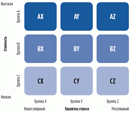 Метод ABC-анализа в логистикеМетод АВС заключается в делении запасов сырья и материалов на три категории по степени важности в зависимости от их удельной стоимости. Суть метода и цель его примененияВсю номенклатуру закупаемых материально-технических ресурсов располагают в порядке убывания общей суммы закупок (как правило, за год). При этом к группе А относят все наименования продукции начиная с первого, общая стоимость закупок по которым составила 75-80% суммарной стоимости годового объема закупок. В группу В включают позиции, общая сумма закупок по которым составляет 10-15% от общей суммы, соответственно в группу С — номенклатурные позиции, закупки по которым составляют 5-10% от общей суммы годовых закупок. АВС-анализ в системе снабжения можно использовать для определения подходов к планированию потребности в материально-технических ресурсах, выбору поставщиков, управлению запасами. Приведу пример. Первый вопрос, который встает перед холдингами, объединяющими несколько крупных компаний (например, нефтедобывающих), — это централизация и децентрализация функций, в том числе и закупочных. Какая номенклатура должна закупаться на уровне департаментов материально-технического обеспечения корпоративного центра, какая — на уровне региональных центров материально-технического обеспечения, а какая — просто отделами материально-технического обеспечения добывающих обществ. Когда я работала заместителем директора департамента материально-технического обеспечения ОАО «Тюменская нефтяная компания», мы приняли решение, что наиболее дорогостоящая номенклатура (то есть номенклатура группы А) будет закупаться в корпоративном центре, номенклатура группы В — на уровне региональных центров, а группы С — добывающими обществами. Кроме того, такой принцип разделения товаров позволил правильно распределить человеческие ресурсы. Как правило, группа А включает небольшое количество номенклатурных позиций по сравнению с В и С, поэтому численность дорогостоящих специалистов в управляющей компании меньше, чем в регионах. При выборе решений по организации управления запасами рекомендуется объединять методологию АВС-анализа с методологией XYZ-анализа. XYZ-анализ предполагает классификацию номенклатуры по среднему статистическому отклонению значения от средней скорости расхода со склада. Так, если потребление по какой-то номенклатуре в течение одного месяца составляет 100 единиц, а в следующем — 10 единиц (то есть является неравномерным), то эта продукция попадет в группу X. Если же, наоборот, по данной номенклатуре потребление из месяца в месяц составляет 100 единиц, то она попадет в группу Z, то есть будет отнесена к номенклатуре с равномерным потреблением. Y — промежуточный вариант. Принципы проведения классификации номенклатуры для определения порядка управления запасами показаны на рисунке.