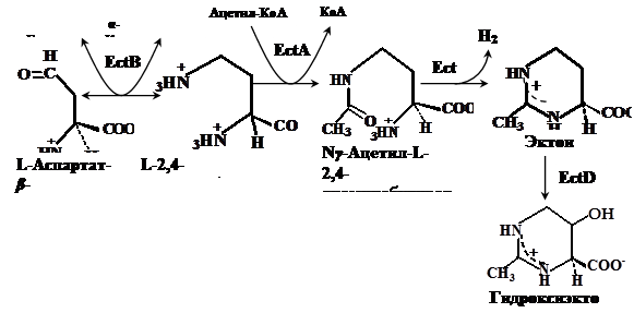 Рис. 1. Путь биосинтеза эктоина и гидроксиэктоина у галотолерантных бактерий (по Peters et al., 1990; Galinski, 1995; Ventosa et al., 1998). EctA - ДAБ-ацетилтрансфераза, EctB - ДAБ-аминотрансфераза, EctC - эктоинсинтаза и EctD - эктоингидроксилаза. Биосинтез гидроксиэктоина осуществляется непосредственным гидроксилированием эктоина эктоингидроксилазой (EctD). К настоящему моменту ген ectD идентифицирован у Streptomyces chrysomallus (Prabhu et al., 2004), Chromohalobacter salexigens (García-Estepa et al., 2006) и Salibacillus salexigens (Bursy et al., 2007). Возможно, существует также альтернативный путь, в котором Ng-ацетил-ДАБ превращается в гидроксиэктоин через 3-гидрокси-Ng-ацетил-ДАБ без участия эктоина (Canovas et al., 1999). Но этот путь энзиматически не подтвержден. Ферменты биосинтеза эктоина. Ферменты биосинтеза эктоина были очищены из H. elongata и частично охарактеризованы (Ono et al., 1999). 2,4-ДAБ-аминотрансфераза является гомогексамером с молекулярной массой субъединицы 44 кДа. ДAБ-аминотрансфераза является пиридоксальфосфат-зависимым ферментом, и требует присутствия ионов К+ для активности и стабильности, что обусловлено возможным наличием в белке специфических связывающих участков для этого иона. Зависимость от калия установлена для многих ферментов галофильных архей и эубактерий (Toney et al., 1995). ДАБ-аминотрансфераза H. elongata специфична к L-глутамату как донору аминогрупп, рНopt - 8.6-8.7, Км для L-глутамата 9.1 мМ, для D,L-аспартатполуальдегида 4.5 мМ. Изоэлектрическая точка рI = 6.2. В настоящее время превращение аспартатполуальдегида в ДАБ известно у нескольких не синтезирующих эктоин бактерий - Xanthomonas sp. и Acinetobacter baumannii (Ikai and Yamamoto, 1997; Rao et al., 1969). ДАБ-аминотрансфераза из А. baumannii участвует в биосинтезе компонента клеточной стенки -1,3-диаминопропана. Этот фермент также специфичен к аспартатполуальдегиду как акцептору аминогрупп и L-глутамату как донору аминогрупп, обладает сходными с ферментом из H. elongata значениями рН оптимума, Км для ДАБ и 2-оксоглутарата (Ikai and Yamamoto, 1997). Однако, в отличие от ферментов из H. elongate и А. baumannii, ДАБ-аминотрансфераза из Xanthomonas sp., использует L-аланин как донор аминогрупп (Rao et al., 1969). ДАБ-ацетилтрансфераза из H. elongata была очищена в 400 раз, однако в гомогенном состоянии фермент получить не удалось вследствие его нестабильности. Кинетические константы также не определены. Молекулярная масса фермента, определенная гель фильтрацией, составила около 45 кДа (Ono et al., 1999). Эктоинсинтаза была очищена до гомогенного состояния в присутствии 1 мМ ДАБ и 2 М NaCl в качестве стабилизаторов. Фермент является гомодимером с молекулярной массой субъединицы 19 кДа, но в буфере с высокой осмолярностью (0.5 М NaCl), использовавшемся при гель-фильтрации, активность фермента не найдена. Поэтому неясно, действительно ли нативная эктоинсинтаза имеет молекулярную массу 35 кДа и является гомодимером, или имела место неспецифическая агрегация мономеров в присутствии высокой концентрации соли. Анализ аминокислотного состава эктоинсинтазы выявил повышенное содержание L-аспартата и L-глутамина. Фермент весьма специфичен к AДAБ, по-видимому, N-ацетильная группа в a-положении не участвует в циклизации молекулы. Изоэлектрическая точка фермента (рI) составила 4.2 - 4.4. Предполагается, что лимитирующим звеном биосинтетической последовательности эктоина является синтез ДАБ с участием ДАБ-аминотрансферазы. Это подтверждает факт отсутствия ДАБ в клетках H. elongata KS3 (Ono et al., 1998). Все три 