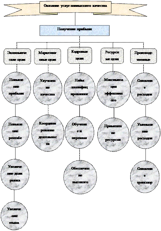 Рис.4. «Дерево целей» ООО «УАЗ-Автотранс». Поскольку цели определяют стремление работать эффективно в заданном ими направлении, постольку для этого необходим период времени для достижения цели разделяется на этапы. На каждом таком этапе цель подразделяется на подцели с тем, чтобы чётко определить на каждом этапе количественно измеряемые рубежи. Чтобы сама цель и подцели были выполнены в полном объёме и в установленные сроки, необходима полная увязка подцелей и цели с ресурсным обеспечением для их достижения. Чтобы лучше рассмотреть цели ООО «УАЗ» следует составить «дерево целей» (рис.5). После составления «дерева целей» необходимо произвести расчёт необходимых факторов производства. Для этого определим, что прибыль от оказываемых услуг может увеличиться за счёт: снижения расходов по оказываемым услугам; увеличения объёма услуг оказываемых населению, с помощью нахождения новых потребителей предлагаемых услуг; снижения транспортных расходов за счёт: - закупки более дешёвого топлива; - уменьшения количества поставок материала, за счёт поставки его более большими партиями; 4. снижения расходов на рекламу; 5. за счёт экономии электроэнергии и экономии горячего и холодного водоснабжения, для этого надо установить счётчики и назначить ответственное лицо, которое будет следить за экономией света и воды в помещениях; 5.Формулирование стратегических альтернатив и выбор стратегии. Принцип создания системы управления предприятием заключается в том, чтобы, провести разделение труда по вертикали, которое осуществляется путем делегирования линейных полномочий сверху вниз по уровням управления, сформированным при построении структуры предприятия. В результате в структуре определяются руководители всех уровней (субъекты управления) и подчиненные им сферы контроля (объекты управления), создается иерархия уровней управления и образуется цепь команд. Кроме делегирования линейных полномочий сверху вниз, нужно определить штабные полномочия, обязанности руководителей по координации (стыковке) работ подразделений по горизонтали и обеспечить интеграцию деятельности всех подразделений для достижения общих целей организации. В организациях обычно выделяют три уровня управления: · руководители низового звена — технический уровень (мастера — младшие начальники), которые руководят непосредственными исполнителями работ; · руководители среднего звена — руководители подразделений; · руководители среднего звена, взаимодействуют на своем уровне с поставщиками и потребителями и поставляют большую часть информации высшему руководству; · руководители высшего звена, которые разрабатывают стратегию, формулируют цели и политику, взаимодействуют с внешней средой, принимают важнейшие решения, отвечают за мотивацию персонала, общую организацию работ и управление предприятием. В результате, для обеспечения полноты и непрерывности процесса управления на предприятии, по нашему мнению, необходимо предусмотреть выполнение следующих управленческих функций: взаимодействие с внешней средой, определение стратегии и политики, организацию работ, подбор, подготовку и мотивацию персонала, планирование и подготовку производства, управление производством, контроль производства и качества продукции, информационное обеспечение, разработку 