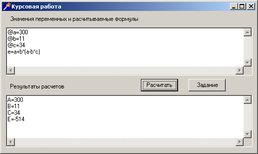 Задание Операции многократной точности (т.е. операции с длинными числами). Конкретизация задания Сначала буквам присваивается значение – например: а=23850934, причем все переменные – целые числа, которые по длине не должны превышать 300 знаков. Потом пишется выражение, например f=(a+b)/c+(d+a). При этом деление – это целое от деления делимого на делитель. Операции сложения, вычитания, умножения – обычные арифметические операции, только это операции над длинными числами. Кроме сложения, вычитания, умножения и деления еще могут быть использованы скобки. Формат ввода Любую строку в поле ввода можно представить в виде S={C,V} Где S – константа либо вычисляемое значение. Если это – константа, то С – число в строковом виде, перед которым стоит символ «@», а если S надо найти то S=V, где V – выражение с переменными и числами. В строке не должно быть пробелов и все переменные состоят из одой буквы. Между строками в поле ввода не должно быть пустых строк. Вывод идет аналогично вводу. Пример ввода и вывода можно посмотреть на рисунке Интерфейс программы. Интерфейс программы – ее внешний вид является наглядным и удобным. В верхнем поле ввода пишутся известные величины и формулы, потом жмется кнопка «Расчитать» и в нижнем поле выводятся в алфавитном порядке все переменные. Программа написана в среде программирования Delphi 6. Использовались только стандартные компоненты – TEdit и TButton. Итого на форме размещено поле ввода, поле вывода и кнопка – для запуска процесса расчета. Использование визуаль