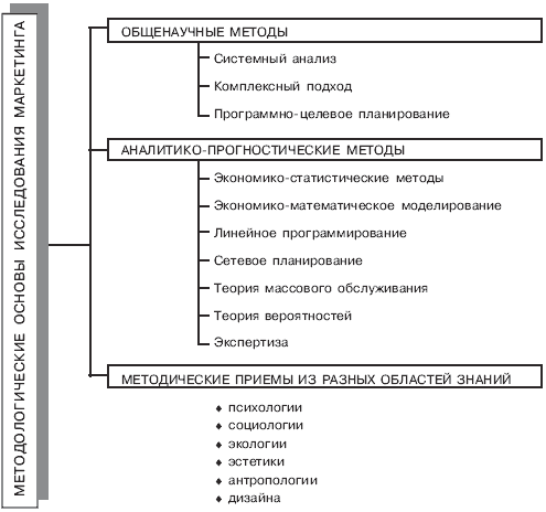 Методы проведения маркетинговых исследований неразрывно связаны с методологическими основами маркетинга, которые, в свою очередь, опираются на общенаучные, аналитикопрогностические методы, а также методические подходы и приемы, заимствованные из многих областей знаний (рис. 6).