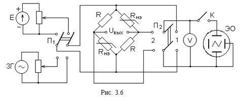 где U – напряжение, измеренное вольтметром, X, Y – проекции ВАХ на оси х, у. 3.3 Исследование мостового стабилизатора напряжения на варисторах Опыт проводится по схеме рис. 3.6 в режиме холостого хода (Rн = ¥). а) Исследование моста на постоянном токе. Отключить осциллограф рубильником К . Переключатель П2 установить в положение «1». Подключить к схеме источник постоянного напряжения и регулируя его напряжение, установить по цифровому вольтметру V напряжение U вх на входе стабилизатора 10 В. Установить переключатель П2 в положение «2» и измерить напряжение U вых на выходе стабилизатора. Провести аналогичные измерения при увеличении входного напряжения до 80 В (через 10 В). Результаты опыта занести в табл.3.2. Коэффициент стабилизации рассчитывается по формуле 3.4. Таблица 3.2