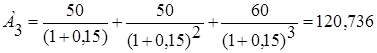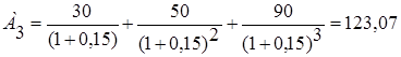 Плата за предоставление средств составляет, соответственно, 86,8, 93, 102,3, 93, 100,75 и 77,5 млн.руб. (третий проект самый дорогой). 1. (Пример 45). Для каждого проекта определяется чистый приведенный, или дисконтный, доход: