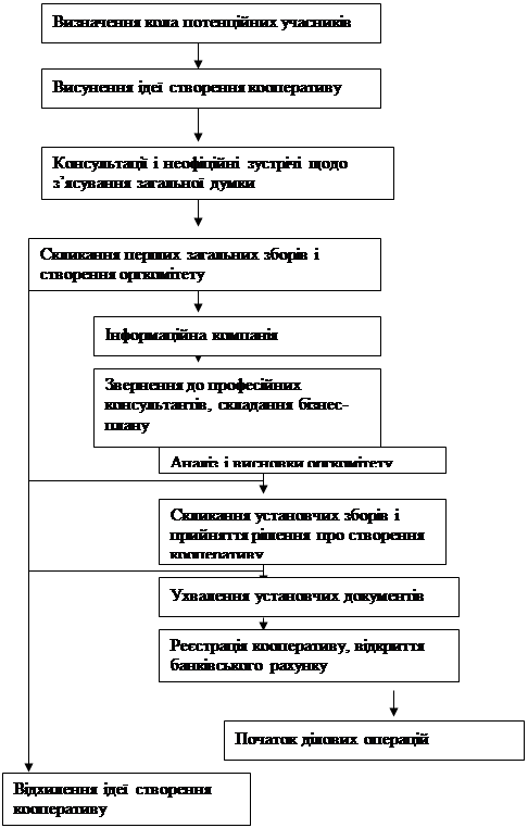Рисунок 1. Алгоритм створення кооперативу кооперативної ініціативи. Виникнення кооперативної ініціативи традиційно пов’язане з допомогою тих, хто досвідченіший в кооперативних справах, хто може дати професійну пораду як розпочати створення кооперативу. На цьому ж етапі визначається конкретна галузь, рід діяльності або форма виробництва, де групові дії є доцільними. Одночасно формується майбутнє ядро кооперативу – ініціативна група, члени якої з самого початку могли б виконувати організаційну роботу і в перспективі стати засновниками кооперативу, а при позитивній оцінці роботи – увійти до органів керівництва. Важливо вже на початковому етапі оцінити можливих учасників кооперації, проводити неофіційні зустрічі з ними, привернути увагу потенційних членів кооперативу. Важлива роль відводиться лідеру ініціативної групи, його наявність є визначальним фактором успішної підготовки до створення кооперативу. Лідер має завдання довести ініціативну групу до логічного кінця етапу висунення кооперативної ініціативи – скликання і проведення перших зборів потенційних учасників кооперації, на яких з’являться демократично обрані лідери. Завершується перший етап скликанням загальних зборів потенційних учасників кооперації. Головним завданням зборів є відповідь на запитання – чи доцільно продовжувати роботу щодо створення кооперативу? При позитивній відповіді на нього, збори обирають організаційний комітет, до якого включають досвідченого консультанта з організаційно-економічних питань. Збори закінчуються постановкою завдань оргкомітету, затвердженням розмірів внесків на проведення організаційної роботи, а також укладанням договору про наміри. На другому етапі створення кооперативу відбувається його техніко – економічне обґрунтування. Головне завдання етапу довести за допомогою відповідних розрахунків, що створення кооперативу реальне і економічно доцільне. На цьому етапі організаційний комітет розпочинає інформаційну компанію, залучає до себе професійних консультантів, які відіграють важливу роль в процесі планування, а також план створення кооперативу (базовий бізнес-план). Якщо складені плани задовольняють членів організаційного комітету, усі проблеми підготовчої фази створення кооперативу вирішені, і пакет необхідних документів розроблено, настає час скликати установчі збори кооперативу. Важливий момент підготовки установчих зборів полягає у розробці проектів засновницьких документів кооперативу ( статуту, установчого договору або протоколу рішень загальних зборів). Якщо висновки комітету щодо створення кооперативу є позитивними, зборам пропонується їх схвалити, а після цього розпочинається новий етап – створення і реєстрація кооперативу. Документом, що підтверджує рішення установчих зборів про створення кооперативу, є установчий договір або протокол загальних зборів. Його підписанти стають засновниками кооперативу. Обрання установчими зборами керівництва кооперативу є особливо відповідальним моментом процедури його створення. Державна реєстрація кооперативу затверджує етап його створення. Після отримання відповідного документу кооператив виходить на етап розпочинання ділових операцій. На цьому етапі відбувається розподіл управлінських функцій між правлінням кооперативу і ви