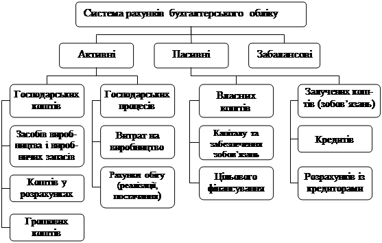 Рисунок 1.1. Класифікація рахунків бухгалтерського обліку за їх призначенням і структурою
