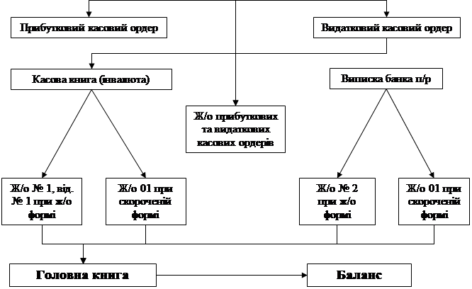 Рис. 2.3 Порядок одержання готівки в банку (1) – заповнення всіх реквізитів чеку та його корінця (2) – проставлення підпису одержувача чеку на корінцеві чеку і передача його до банку (3) – перевірка правильності заповнення та його оплата (4) – одержання грошей в касі банку (5) – складання звіту касира Будь-яке перерахування (крім сплати податків та зборів до бюджету) здійснюється на основі документального підтвердження, до них відносяться: акти виконаних робіт, наданих послуг, договори, накладні, рахунки-фактури, ТТН, листи, накази та ін. Банк реєструє усі здійснені операції з надходження та списання коштів з поточного рахунку у спеціальній виписці з особового рахунку, із вказанням підтверджуючих документів. Даний документ замінює собою регістр аналітичного обліку за операціями на поточному рахунку та одночасно є підставою для бухгалтерських записів. Бухгалтер при отриманні виписки нумерує її, перевіряє наявність підтверджувальних документів, на підставі яких зараховані чи списані кошти, перевіряє відповідність сум у виписці сумам у документах і проставляє кореспонденцію відповідно до проведених операцій. На полях проставляються коди, а на документах ще і порядкові номери запису у виписці. Після проведення кожної господарської операції касир робить записи у касовій книзі, після чого дані із первинних документів групуються в Журнал №1, тут відображаються з кредиту рахунка 31 "Рахунки в банках" в дебет рахунків, а у відомості 1-2 - в дебет рахунка 31 "Рахунки в банках" з кредиту рахунків. Записи в Журналі 1 і відомості 1-2 ведуться на підставі виписок банку за рахунками і доданими до них документами. Групування сум для відображення в Журналі 1 і відомості 1-2 необхідних підсумків здійснюється шляхом підрахунку відповідних даних у виписках чи доданих до них документах згідно з наведеними у них бухгалтерськими проведеннями. Таблиця 2.3 Документування операцій з грошовими коштами