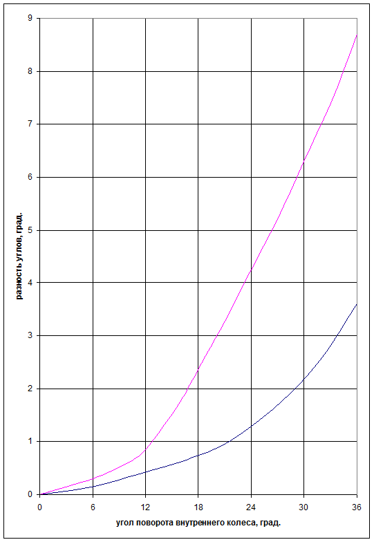 Рис. 4. Зависимость среднего угла поворота управляемых колес от хода рейки На рис. 4 показан график зависимости среднего угла поворота колес от хода рейки. Данные для построения графика получены с помощью программы WKFB5M1, которая применяется в отделе общей компоновки и отделе ходовой части и отделе тормозов УПШ ДТР ВАЗа для расчета кинематики подвески МакФерсон и реечного рулевого управления. По графику определяем, что для обеспечения угла поворота колес q=34,320 необходим ход рейки в одну сторону равный 75,5 мм. Полный ход рейки l=151 мм. На рис. 5 показана зависимость разности углов поворота наружнего и внутреннего колес в функции угла поворота внутреннего колеса. Здесь же приведена рассчитанная по Аккерману кривая требуемого изменения разности углов поворота колес. Показателем, служащим для оценки кинематики рулевого привода, является разность углов поворота колес при угле поворота внутреннего колеса, равном 200 : 1.5 Передаточное отношение рулевого управления Общее кинематическое передаточное отношение рулевого управления, определяемое передаточными числами механизма Uр.м. и привода Uр.п. равно отношению полного угла поворота рулевого колеса к углу поворота колес от упора до упора:
