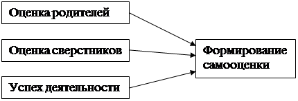 Значительное влияние на личность подростка и юноши, в частности, на его самооценку, оказывает стиль взаимоотношений с родителями, который лишь отчасти обусловлен их социальным положением. Таким образом, самооценка ребенка отражает родительскую оценку его достоинств (схема 2). Когда родители поддерживают ребенка, внимательны и добры к нему, выражают свое одобрение и другие положительные чувства, старшеклассник утверждается в мысли, что родители принимают его в качестве способного, продуктивного и достойного индивида. Наилучшие взаимоотношения с родителями складываются обычно при демократическом стиле воспитания. Этот стиль в наибольшей степени способствует воспитанию самостоятельности, активности, инициативы и социальной ответственности. Поведение ребёнка направляется в этом случае последовательно и вместе с тем четко и рационально. Крайние стили воспитания, независимо от того авторитарный ли это стиль, или попустительский, дают плохие результаты. К старшим классам автономия в поведении, как правило, уже достаточно велика: старшеклассник самостоятельно распределяет своё время, выбирает друзей, способы досуга и т.д. В семьях с более или менее авторитарным стилем общения эта автоматизация иногда вызывает острые конфликты. Добиваясь расширения своих прав, старшеклассники нередко предъявляют к родителям завышенные требования, в том числе и материальные. Во многих обеспеченных семьях дети не знают источники дохода и не заботятся об этом. “Значимость” для юноши и девушек их родителей и сверстников принципиально неодинакова в разных средах деятельности. Наибольшая автономия от родителей при ориентации на сверстников наблюдается в среде досуга, развлечений, свободного общения, потребительских ориентаций. При всей их тяге к самостоятельности, юноши и девушки остро нуждаются в жизненном опыте и помощи старших. Многие волнующие их темы они вообще не могут обсуждать со сверстниками, так как им мешает самолюбие. Семья же остаётся тем местом, где подросток и юноша чувствуют себя наиболее спокойно и уверенно. Общение со сверстниками тоже необходимо для становления самоопределения в ранней юности. Это общение требует взаимопонимания, внутренней близости, в нем раскрывается собственное реальное “Я”. Оно поддерживает самопринятие, самоуважение. Для того чтобы ребенок чувствовал себя счастливым, был способен лучше адаптироваться и преодолевать трудности, уму необходимо иметь положительное представление о себе. Дети с отрицательной самооценкой склонны чуть ли не в каждом деле находить непреодолимые препятствия. У них высокий уровень тревожности, они хуже приспосабливаются к школьной жизни, трудно сходятся со сверстниками, учатся с явным напряжением. Как указывают многие авторы, положительная самооценка определяется тремя факторами: творческой убежденностью в импонировании другим людям, уверенностью в способности к тому или иному виду деятельности и чувством собственной значимости [5]. Каждый человек стремится к одобрению со стороны других людей. Всякая деятельность имеет определенную цель. Способность достичь ее дает чувство уверенности в своих силах. Для учащихся это овладение учебным материалом, для учителей – владение своим предметом и способность добиваться от учащихся нужного уровня знаний. Успех в эт