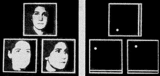 Рис. 5.3. Задачи на распознавание и локализацию. Примеры рисунков, предъявлявшихся в задачах на сравнение а) лиц и 6) расположений точки (по: Gradyetal., 1992). Разделение труда в зрительной коре не ограничивается делением между локализацией и распознаванием. Оказывается, что разные виды информации, используемой при распознавании, — например, цвет, форма, текстура — обрабатываются различными участками или клетками распознающего отдела коры. Аналогичным образом, различным видам информации, используемым при распознавании — форме, цвету и текстуре, — также соответствуют специализированные подотделы мозга, ответственные за их анализ (Livingstone & Hubel, 1988; Zeki, 1993). Таким образом, зрительная кора состоит из многочисленных «модулей переработки», каждый из которых специализируется на выполнении определенной задачи. Чем больше мы узнаем о нейрологическом базисе других сенсорных модальностей (а также о других психологических функциях), тем более правдоподобной представляется данная модель, предполагающая разделение труда между различными модулями переработки информации. Локализация Чтобы знать расположение окружающих предметов, первое, что надо сделать, — это отделить объекты друг от друга и от фона. Затем перцептивная система может определять положение объектов трехмерного мира, включая их удаленность и характер движения. Сегрегация объектов Изображение, спроецированное на сетчатке глаза, является мозаикой из элементов различной яркости и цвета. Перцептивная система каким-то образом организует эту мозаику в ряд дискретных объектов, выступающих на некотором фоне. Такого рода организацией весьма интересовалась гештальт-психология — направление в психологии, возникшее в Германии в начале XXвека. Гештальт-психологи особую важность придавали восприятию целостных объектов или форм; они предложили ряд принципов, по которым мы организуем воспринимаемые объекты. Фигура и фон. В стимуле, который состоит из двух и более различных участков, мы обычно видим одну часть как фигуру, а другую — как фон. Участки, видимые как фигура, содержат интересующие нас объекты: они кажутся более твердыми, чем фон, и видятся впереди фона. Это простейший вид перцептивной организации. Рис. 5.4а показывает, что организация по принципу фигуры и фона может быть обратимой. Если вы посмотрите на эту картинку несколько секунд, то заметите, что в качестве фигуры можете воспринимать вазу или два профиля. То есть один и тот же контур можно видеть как часть одного или другого объекта. Тот факт, что вы можете делать это сами, говорит о том, что организация фигуры и фона является не частью физического стимула, а результатом работы нашей перцептивной системы.