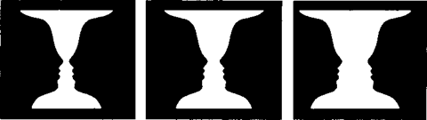 Рис. 5.4. Обратимость фигуры и фона. Три паттерна, на которых можно видеть либо белую вазу, либо два черных лица. Обратите внимание, что мы не можем видеть обе организации одновременно, даже если вы знаете, что обе они могут быть восприняты. Если белая область меньше по площади (а), вы скорее будете видеть вазу; если же меньшую площадь занимает черная область (б), вы скорее будете видеть лица. Заметьте также, что лица и вазу невозможно увидеть одновременно. Вы «знаете», что можете увидеть каждое из этих изображений, но вы не можете «видеть» и то и другое изображение в один и тот же момент. Вообще говоря, чем меньше по размерам рассматриваемая область или форма, тем более вероятно, что вы сможете увидеть ее как фигуру. Это можно продемонстрировать, сравнив рис. 5.4а, б и в. Вазу легче увидеть, когда меньше по размерам белая область, а лица легче увидеть, когда меньше черная область (Weisstein & Wong, 1986). На рис. 5.5 показан более сложный вариант обратимости фигуры и фона . (Заметим, что отношения типа фигуры и фона могут восприниматься не только зрительно, но и в других модальностях. Например, можно слышать пение птицы на фоне уличных шумов или мелодию скрипки на фоне звуков остального оркестра.)