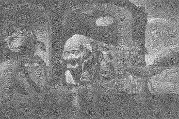 Рис. 5.5. Невольничий рынок с исчезающим бюстом Вольтера. Обратимая фигура находится в центре этой картины Сальватора Дали (1940). Две монашки, стоящие под сводчатым проходом, превращаются в форму бюста Вольтера. Группировка объектов. Мы не только видим объекты на некотором фоне, но и группируем их определенным образом. Даже когда мы смотрим на простые паттерны из линий или точек, они объединяются в группы. В качестве примера посмотрите на матрицу из точек, показанную на рис. 5.6а. Эти точки расположены на равных расстояниях друг от друга, поэтому их можно видеть как организованные в ряды и колонки и даже по диагональным линиям. Таким образом, перед нами неоднозначный паттерн, сходный по своим принципам организации с изображенными на рис. 5.4 и 5.5. Только одну из организаций можно видеть в каждый момент времени, и периодически происходит переключение между этими организациями.