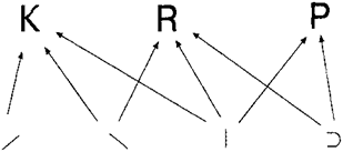 Рис. 5.13. Простая сеть. Нижний уровень этой сети содержит признаки (наклонные линии, вертикальная линия и кривая, выгнутая вправо), верхний уровень содержит буквы, а связь между признаком и буквой означает, что данный признак является частью этой буквы. Поскольку эти связи возбуждающие, при активации признака активация передается букве. Нижний уровень сети, показанной на рис. 5.13, содержит признаки — например, правую диагональ, левую диагональ, верикальную линию и кривую, выгнутую вправо. Эти признаки и буквы мы будем называть узлами сети. Связь между узлом признака и узлом буквы означает, что данный признак принадлежит этой букве. Стрелки на концах соединений означают, что связи являются возбуждающими; когда активируется тот или иной признак, активация передается букве (аналогично тому, как электрические импульсы распространяются по сети нейронов). Сеть на рис. 5.13 говорит нам, что буква K состоит из правой диагонали, левой диагонали и вертикальной линии; буква Rсостоит из левой диагонали, вертикальной линии и кривой, выгнутой вправо; а буква P состоит из вертикальной линии и кривой, выгнутой вправо. (Для простоты мы здесь опускаем взаимосвязи признаков.) Чтобы понять, как при помощи этой сети можно распознать (или подобрать) букву, посмотрим, что происходит при предъявлении буквы K. Она будет активировать правую диагональ, левую диагональ и вертикальную линию. Все эти три признака будут активировать узел буквы K; два признака — левая диагональ и вертикальная линия — будут активировать узел буквы Rи один признак — вертикальная линия — будет активировать узел буквы P. Только в узле буквы K активированы все признаки, и следовательно, она будет выбрана как наиболее подходящая. Эта модель слишком проста для объяснения многих аспектов распознавания. Чтобы понять, чего в этой модели не хватает, посмотрим, что происходит, когда предъявляется буква R(рис. 5.14). Она активирует левую диагональ, вертикальную линию и кривую, выгнутую вправо. Теперь в обоих узлах букв Rи P активированными оказываются все признаки этих букв, и в этой модели никак нельзя решить, какую букву следует выбрать. Чтобы остановиться на одном определенном варианте, эта модель должна знать: наличие левой диагонали означает, что на входе не может быть буквы P. Подобная отрицательная информация учтена в усложненной сети, показанной на рис. 5.14.
