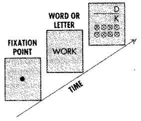 Рис. 5.15. Восприятие букв и слов. Этот рисунок иллюстрирует последовательность событий в эксперименте, в котором сравнивалось восприятие букв, предъявлявшихся отдельно или в составе слова. Сначала испытуемые видели точку фиксации, за ней следовало слово или отдельная буква, которые предъявлялись всего на несколько миллисекунд. Затем предъявлялся стимул, содержащий маскирующие знаки на том месте, где находились буквы, и два варианта ответа. Испытуемым надо было решить, какой из двух вариантов слова или буквы предъявлялся ранее (по: Reicher, 1969). Чтобы объяснить этот результат, в вышеописанную сеть со связями между признаками и буквами надо внести несколько изменений. Во-первых, в нее надо добавить уровень слов и помимо этого добавить возбуждающие и тормозные связи от букв к словам (рис. 5.16).