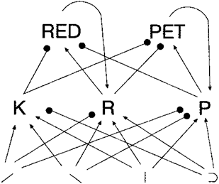 Рис. 5.14. Усложненная сеть. Помимо активирующих связей эта сеть содержит тормозящие соединения между признаками и теми буквами, которые этих признаков не содержат. В этой сети есть все то же, что и в предыдущей, плюс тормозные связи (они показаны с точками на концах) между признаками и теми буквами, которые не содержат этих признаков. Когда признак соединен с буквой тормозной связью, активация этого признака уменьшает активацию буквы. Если буква Rпредъявляется сети, показанной на рис. 5.14, левая диагональ вызывает торможение в узле буквы Р, снижая тем самым ее общий уровень активации; теперь наибольшая активация будет в узле буквы Rи, следовательно, она будет выбрана как наилучшее соответствие. Сети с обратной связью. Основную идею модели, которую мы только что рассмотрели, а именно что описание буквы должно содержать как те признаки, которые она имеет, так и те, которые в ней отсутствуют, — первоначально предложили исследователи искусственного интеллекта, которые разрабатывали компьютерные программы, моделирующие восприятие букв человеком. Хотя в то время такие идеи пользовались относительным успехом, в конце концов оказалось, что они неспособны адекватно объяснить данные о влиянии контекста на способность воспринимать буквы. В частности, оставалось непонятным, почему буква легче воспринимается, когда она предъявляется в составе слова, чем когда она предъявляется сама по себе. Так, если испытуемым на короткое время предъявляют изображение либо только буквы K, либо слова «WORK» (работа), а затем спрашивают, была ли последняя буква K или D, они отвечают точнее, если было предъявлено целое слово, а не одна буква (рис. 5.15).