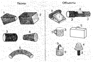 Рис. 5.17. Возможный набор признаков (геонов) естественных объектов. а) Клин, куб, цилиндр и конус могут быть признаками сложных объектов. б) Из комбинации признаков (геонов) получаются естественные объекты. Заметьте, что если дугу (геон 5) присоединить к цилиндру (геон 3), получается чашка; если же дугу присоединить к верху цилиндра, получится ведро (по: Biederman, 1990). То, что геоны являются признаками объектов, подтвердилось в экспериментах, в которых испытуемым предлагалось распознать нарисованные объекты, предъявляемые на короткое время. Общий результат был таков, что объект распознается настолько хорошо, насколько хорошо воспринимаются его геоны. В одном эксперименте стиралась часть формы объекта; в одном случае стирание мешало восстановлению геонов (правая колонка на рис. 5.18), в другом — не мешало (средняя колонка на рис. 5.18). Объекты распознавались намного лучше, когда стирание не интерферировало с геонами.