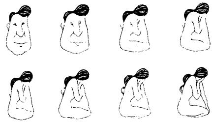 Рис. 5.19. Двойственный стимул. На этом неоднозначном рисунке можно видеть или молодую женщину, или старуху. Большинство видит сначала старуху. Молодая женщина отвернулась, и видна левая часть ее лица. Ее подбородок образует нос старухи, а цепочка у нее на шее — рот старухи (по: Boring, 1930). Этот эффект временного контекста виден на другом наборе изображений на рис. 5.20. Смотрите на них, как при чтении рассказа в картинках — слева направо и сверху вниз. Картинки в середине этой последовательности неоднозначны. Если вы смотрели на эти изображения в предложенной последовательности, то скорее всего видели в них мужское лицо. Если вы посмотрите на них в обратном порядке, то в двойственных картинках скорее всего увидите молодую женщину.