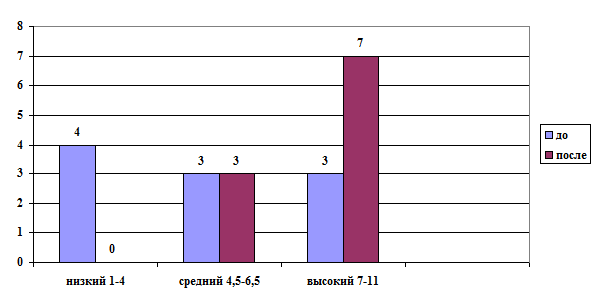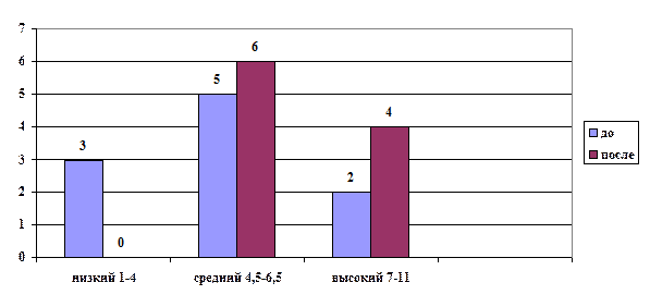 Контрольная группа Итак, как видно из диаграммы 1 в контрольной группе произошли изменения после формирующего этапа. Если на констатирующем этапе эксперимента было выявлено 3 учащихся с низким уровнем развития творческих способностей, то на контрольном этапе отсутствует. Со средним уровнем выявлено 6 учащихся, с высоким уровнем – 4 школьника, тогда как на первом этапе было со средним уровнем – 5 учащихся, с высоким только 4 школьника. Диаграмма 2 Уровень развития творческих способностей до и после эксперимента Экспериментальная группа