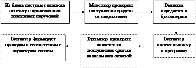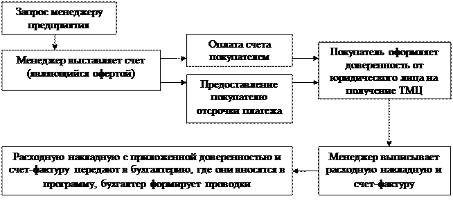Рис.2. Этапы обработки документов по расчетам с покупателями и заказчиками Покупатели формируют запросы менеджерам предприятия. Менеджер выставляет счет, являющийся, офертой и отправляет его покупателям. По условиям договора поставки покупателю может быть предоставлена отсрочка платежа (до 30 дней). При отпуске товаров в продажу менеджер предприятия выписывает расходную накладную и счет-фактуру. Покупатели либо сами забирают товар со склада предприятия, либо просят отправить товар транспортной компанией. В первом случае покупатель оформляет доверенность от юридического лица на получение товарно-материальных ценностей, а во втором случае доверенность заменяется накладной транспортно-экспедиционной компании. Полученные доверенности прикалываются ко второму экземпляру расходных накладных, остающихся в бухгалтерии предприятия, корешок доверенности оформляется и возвращается покупателю. Если товар покупателю отправляется транспортно-экспедиционной компанией, то в этом случае к расходной накладной прикрепляется только накладная транспортной компании.